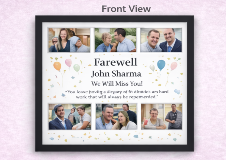 If you would like to add a special farewell message or personalized note along with the photo frame, our team will design it and include it with your artwork. If you are looking for creative ideas or want help designing the perfect farewell memory frame, you are always welcome to visit us or connect with our team to discuss and finalize the framing.